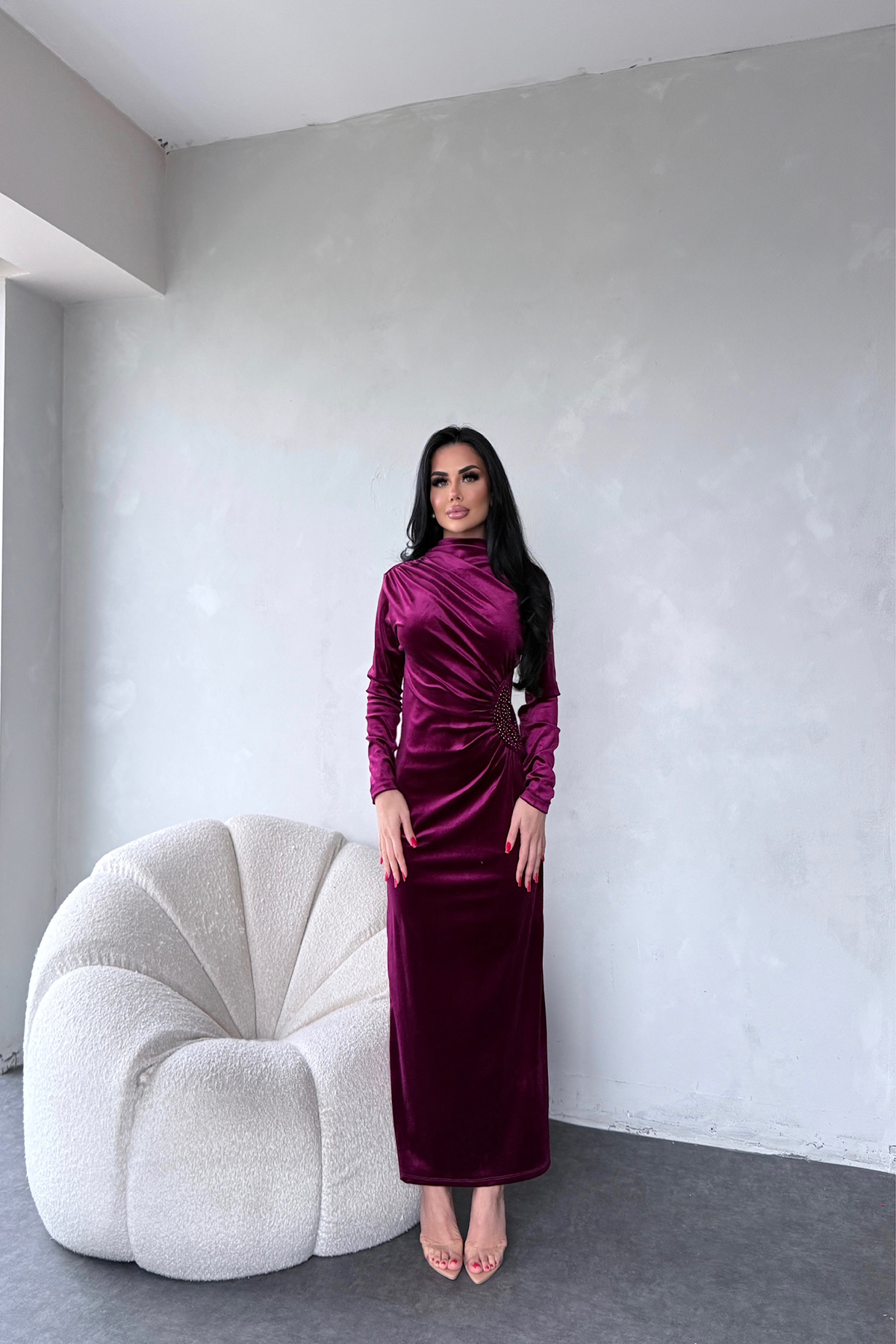 BALIKÇI YAKA BEL TAŞLI DRAPELİ KADİFE ELBİSE