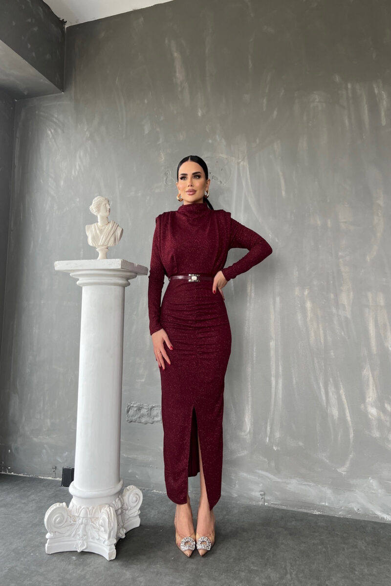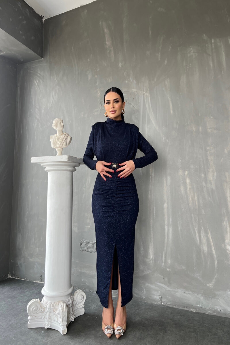 BALIKÇI YAKA KEMER DETAYLI SİMLİ TASARIM ELBİSE