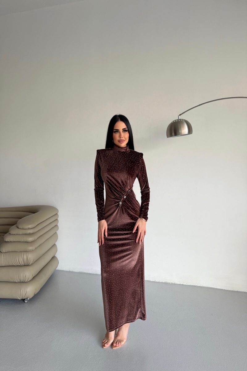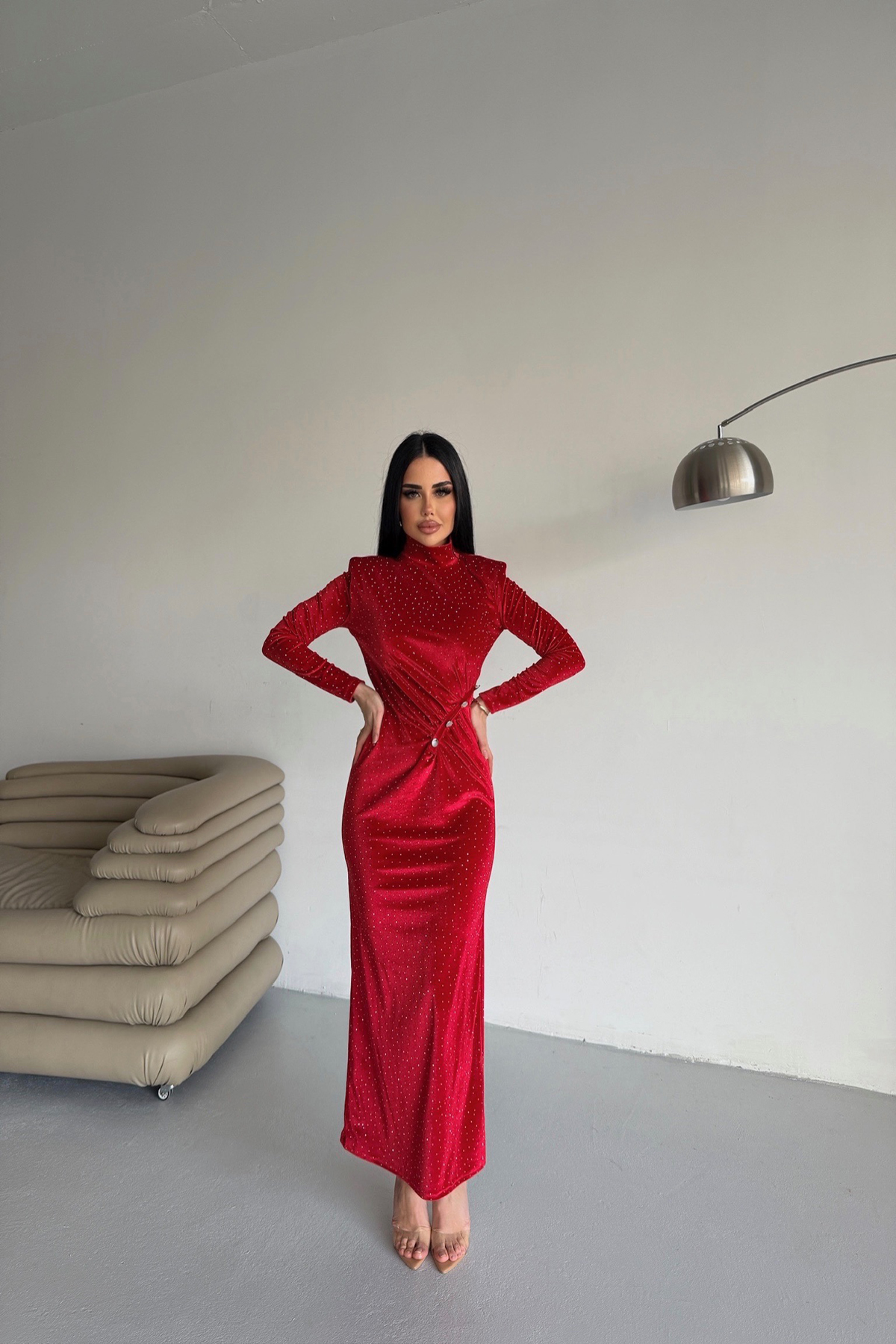BEL DÜĞME DETAYLI KADİFE ELBİSE