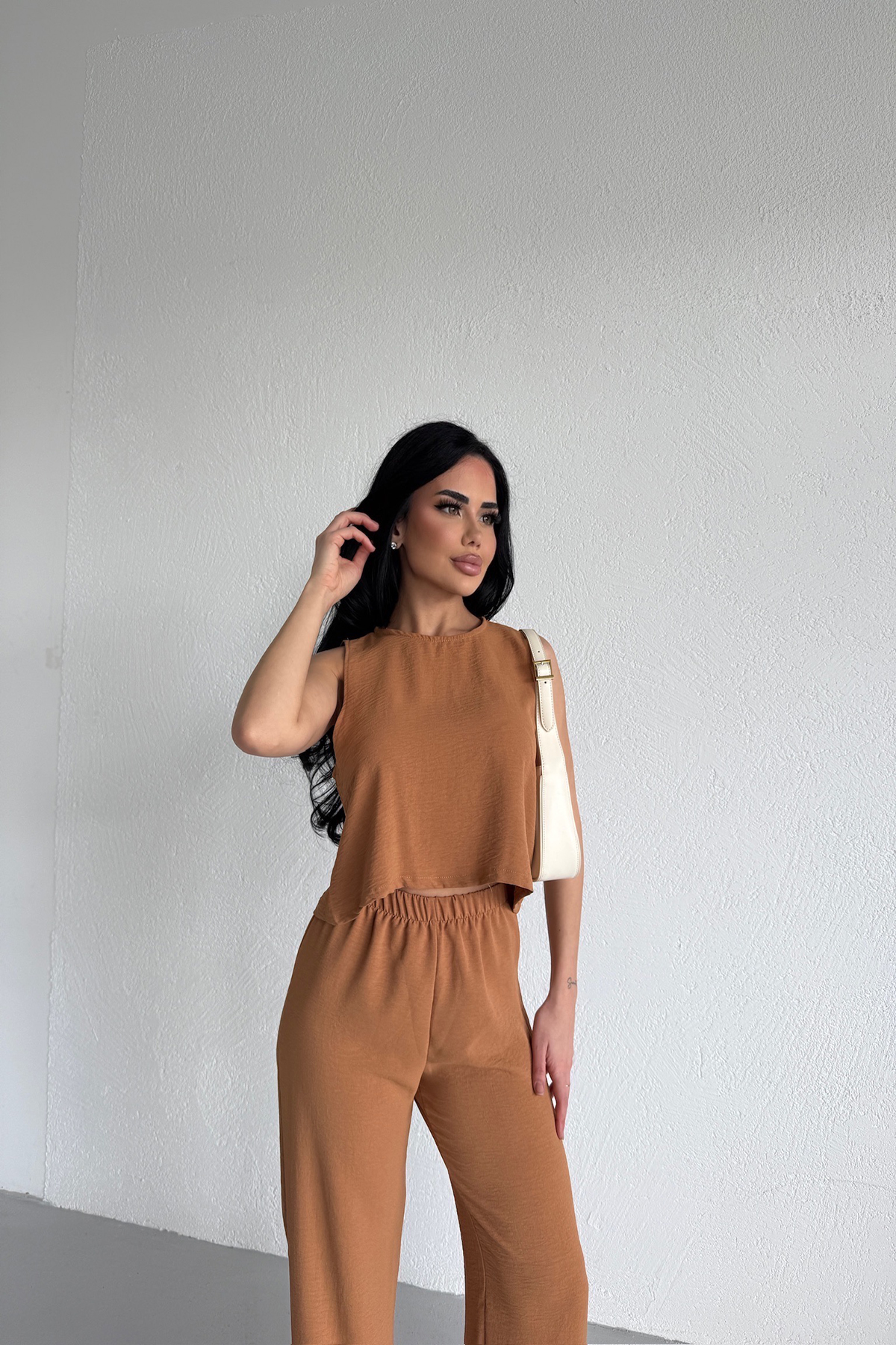 Model üzerindeki ürün, M beden veya Standart beden olarak sunulmaktadır.