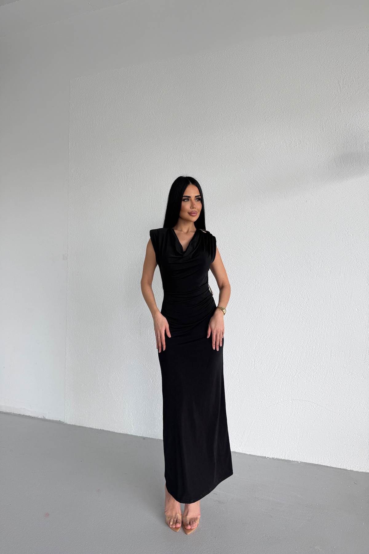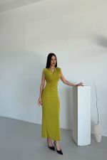 DEGAJE YAKA BEL TOKALI TASARIM ELBİSE
