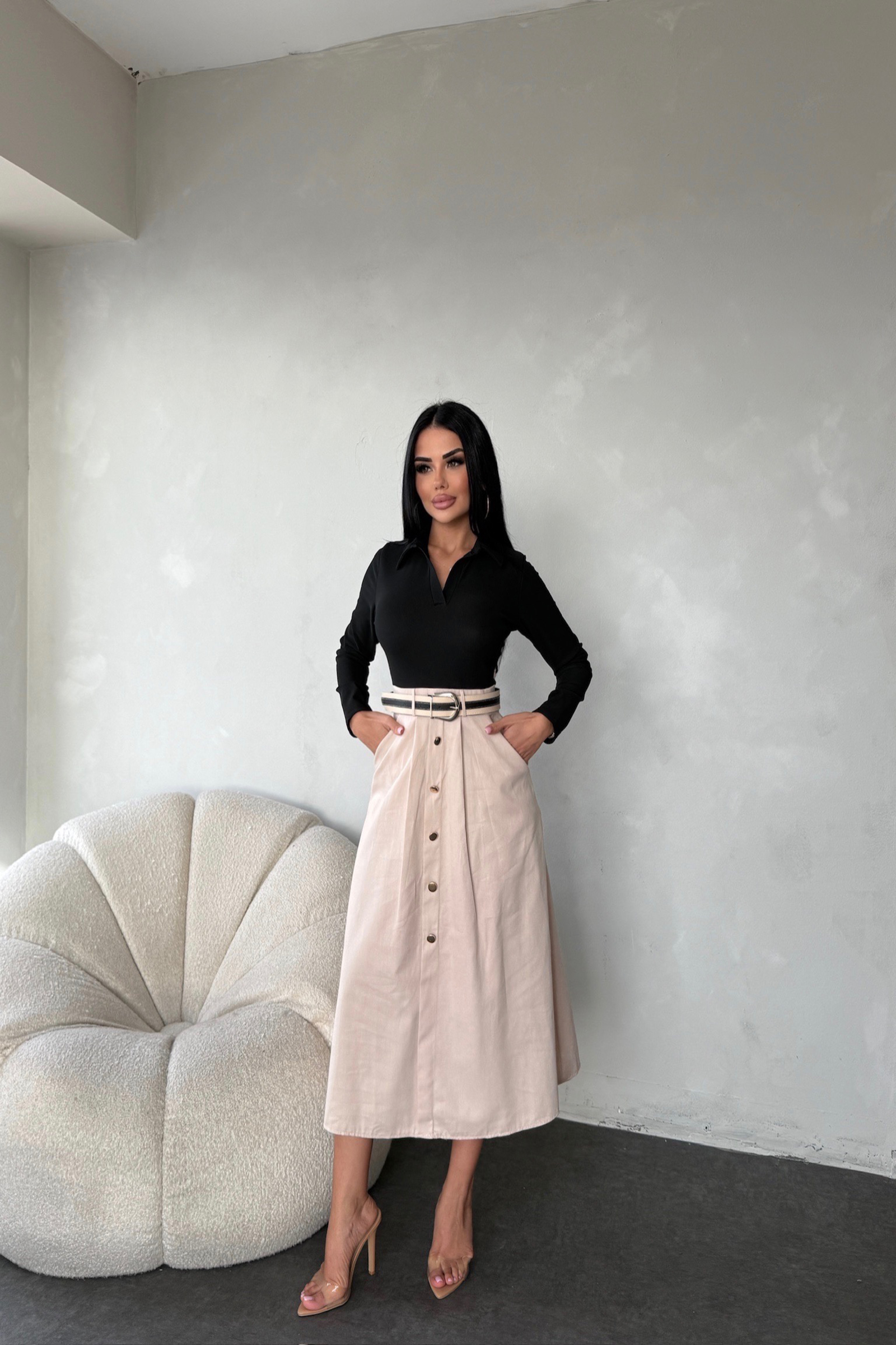 GÖMLEK YAKA ETEĞİ DÜĞMELİ KEMERLİ ELBİSE