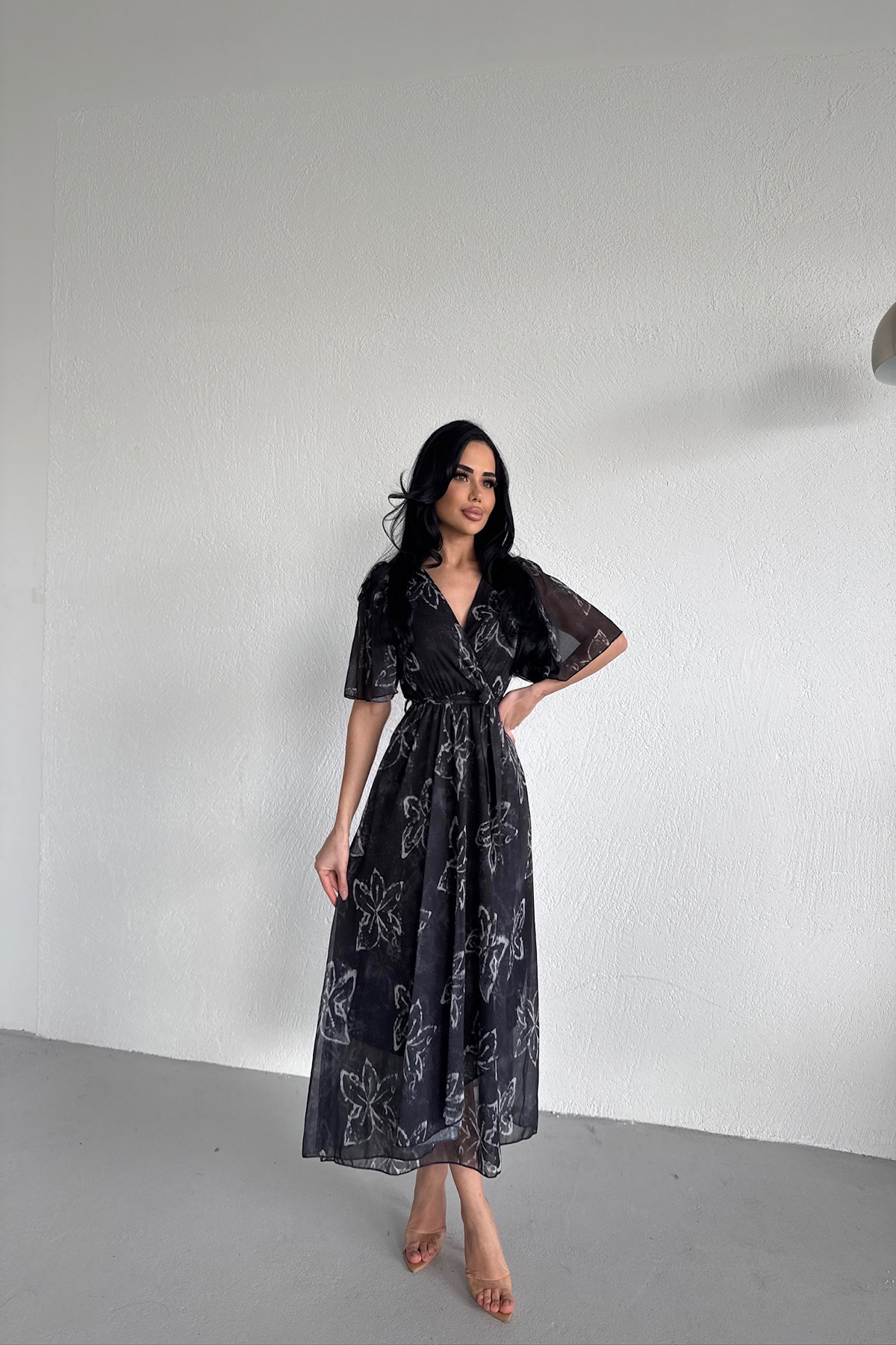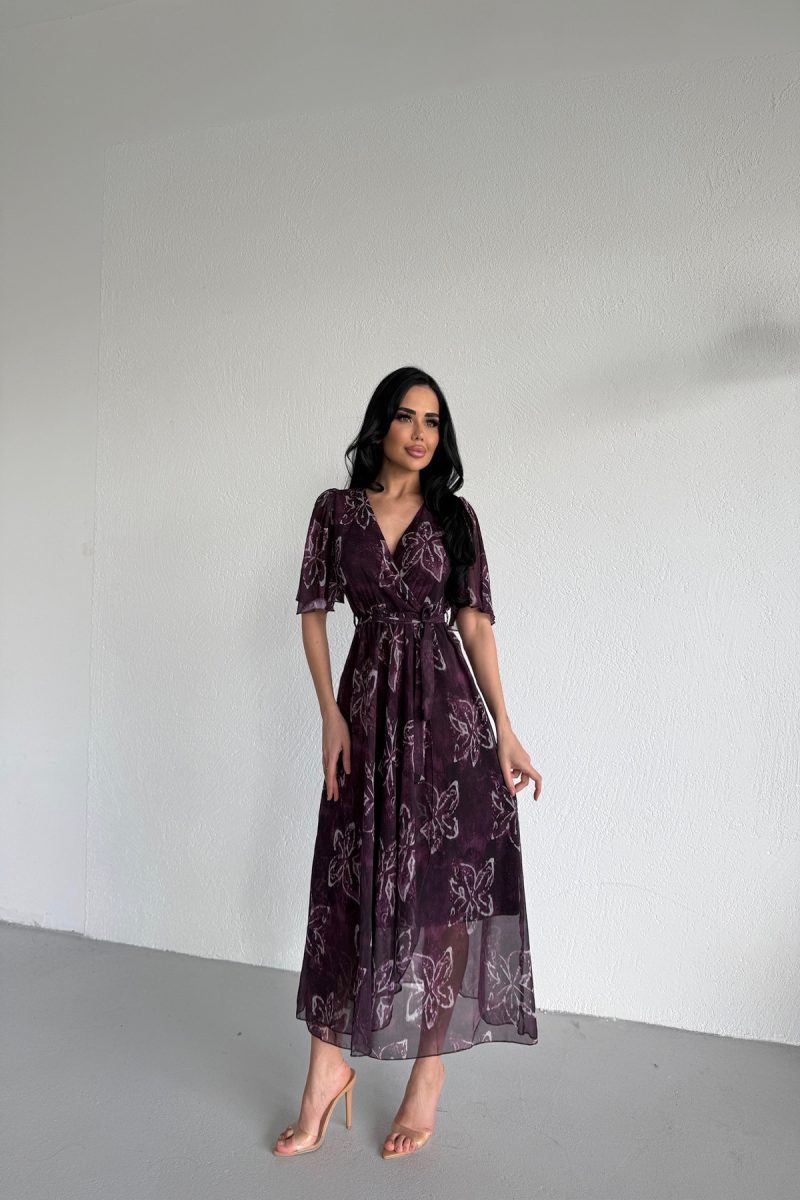 KRUVAZE YAKA DESENLİ VOLANLI ŞİFON ELBİSE