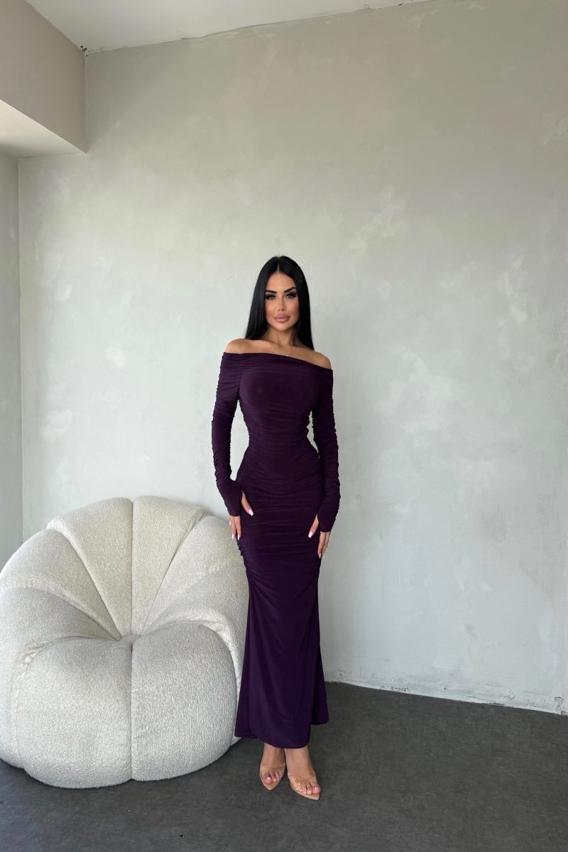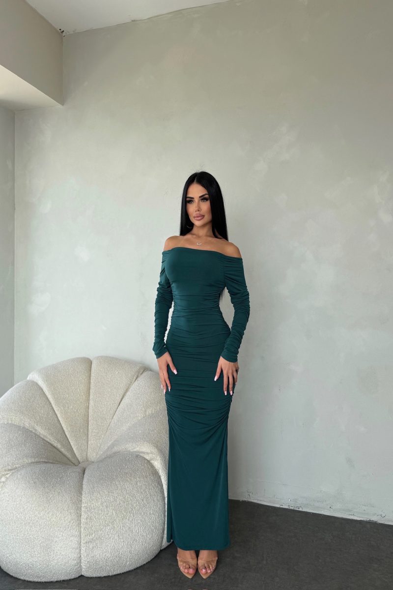 MADONNA YAKA BEL OMUZ LASTİK DETAYLI ELBİSE