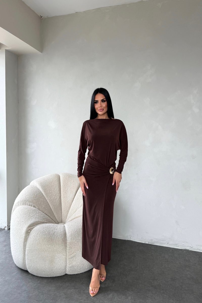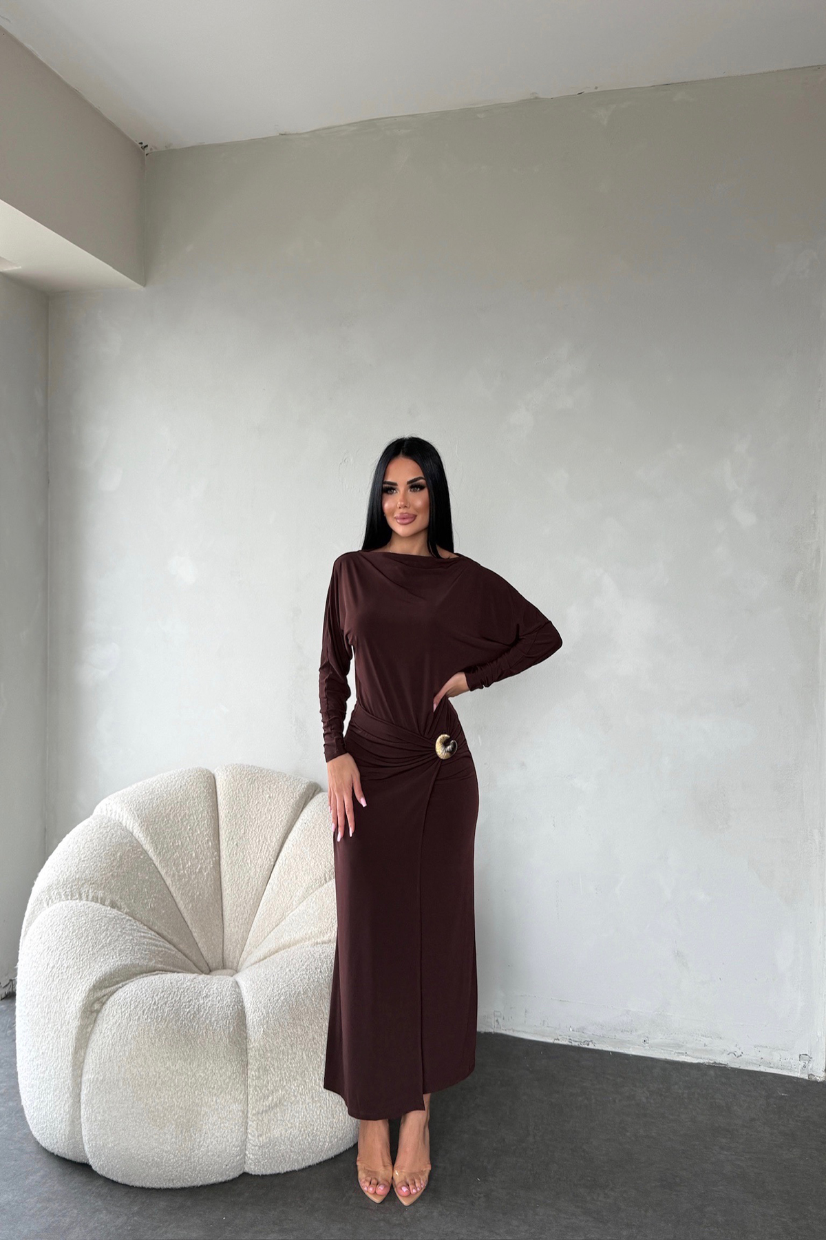 YAKA DETAYLI ETEĞİ YANDAN TOKALI SANDY ELBİSE